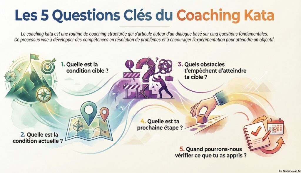 En coaching kata, le cœur du processus repose sur ces 5 questions clés :